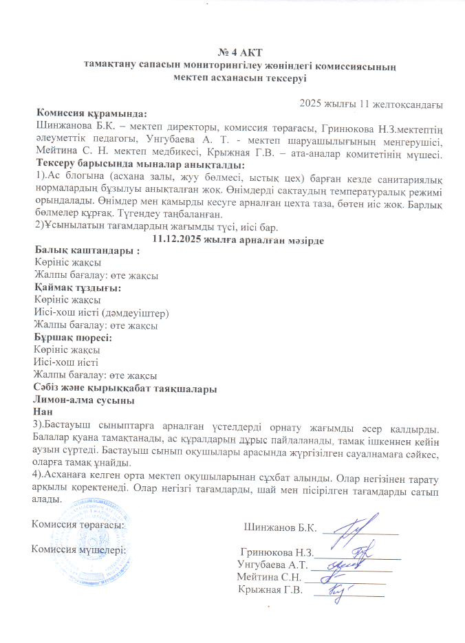 Тамақ өнімдерінің сапасын бақылау туралы № 4 АКТ