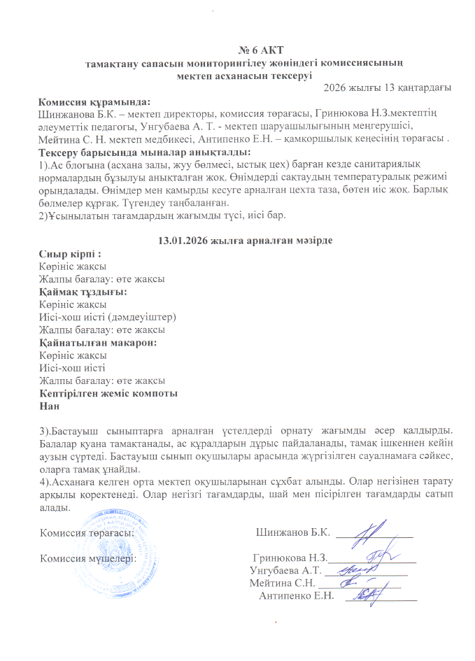 Тамақ өнімдерінің сапасын бақылау туралы № 6 АКТ
