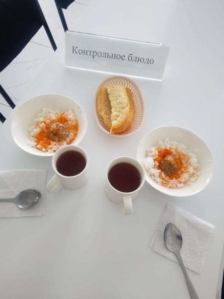 Сиыр котлеті күрішпен, компот нанымен безендірілген
