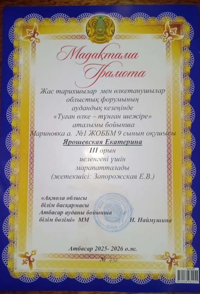 "Менің кіші Отаным" аудандық байқауында "Менің өлкемнің тарихы" номинациясы бойынша "Мариновка ауылының №1 жалпы білім беретін мектеп" КММ оқушысы Бугун Злата, 9 "Б" сынып оқушысы өз мектебін және туған ауылын лайықты түрде таныстырып, II орын алды....