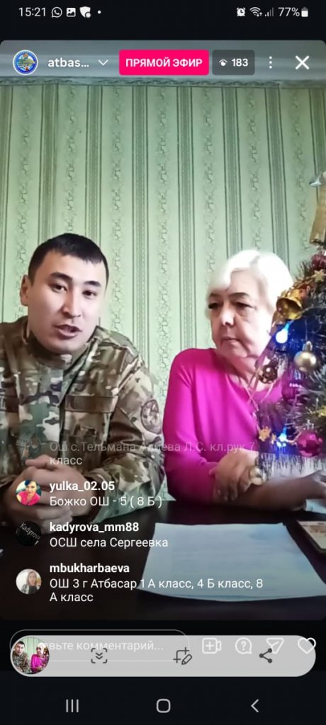 26 желтоқсанда Атбасар ауданының ата-аналар жұртшылығымен "Қауіпсіз қысқы демалыс" тақырыбында тікелей эфир өтті. Кездесуге білім бөлімінің басшысы Н.Г. Наймушина, ауданның түрлі қызметтерінің өкілдері: дәрігер-терапевт, өрт, құқық...