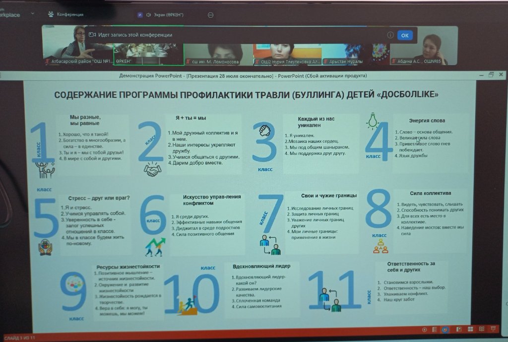 08 Қазанда ZOOM платформасында "Балалардың қауіпсіздігі қоғамның басымдығы ретінде" тақырыбында халықаралық дөңгелек үстел өтті, оның ұйымдастырушысы "Өркен"балалардың әл – ауқатының ұлттық ғылыми-практикалық институты болды. "Мариновка ауылының №1ЖББМ" КММ директорының орынбасары И. П. Холод конференцияның арқасында одан әрі жұмыс істеу үшін "Досбол like" бағдарламасы бойынша, сондай-ақ балалардың қауіпсіздігі туралы педагогтармен және ата-аналармен жұмыс бойынша көптеген пайдалы, қажетті ақпарат пен ұсыныстар алды.