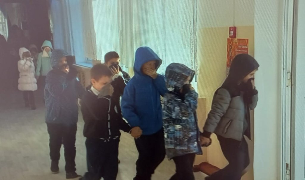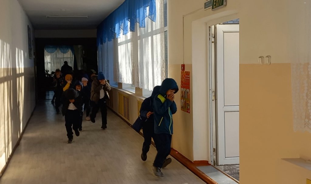 Мектеп ғимаратынан шұғыл эвакуация туралы барлығына ескерту дабылы. Аңыз бойынша, вахтер спортзалдың есігінен түтін шыққанын байқап, мектеп әкімшілігін хабардар етті.