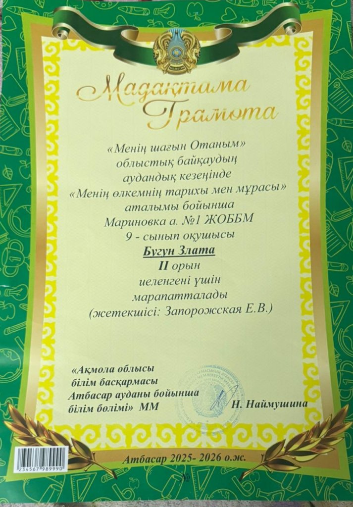 "Менің кіші Отаным" аудандық байқауында "Менің өлкемнің тарихы" номинациясы бойынша "Мариновка ауылының №1 жалпы білім беретін мектеп" КММ оқушысы Бугун Злата, 9 "Б" сынып оқушысы өз мектебін және туған ауылын лайықты түрде таныстырып, II орын алды.