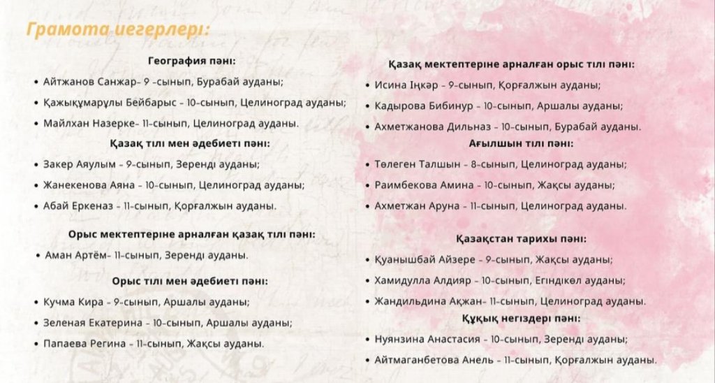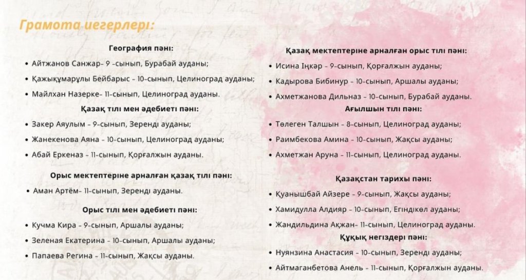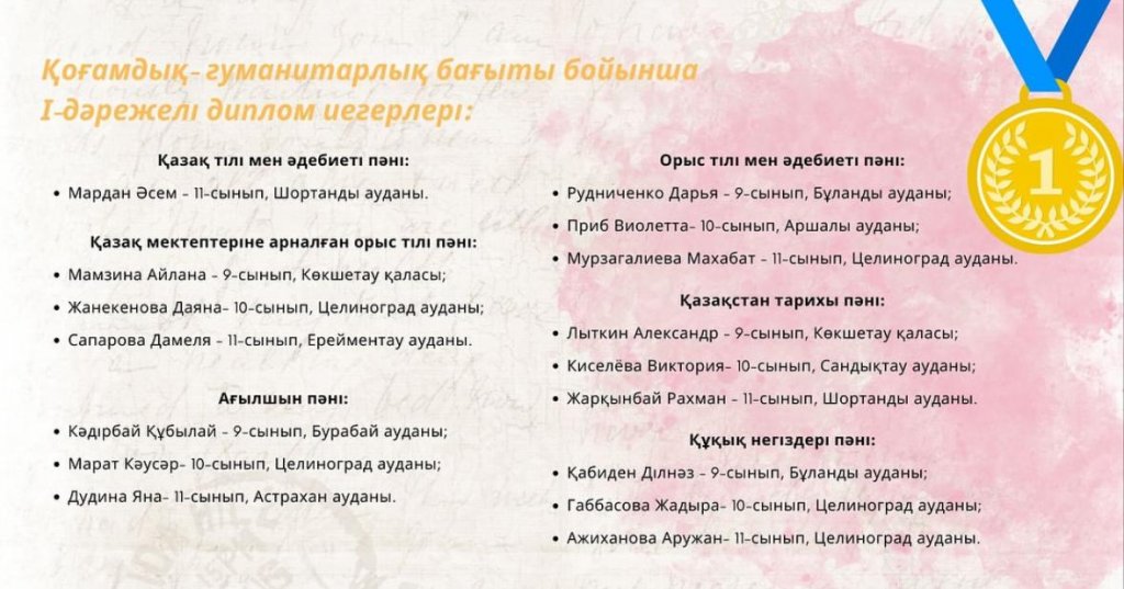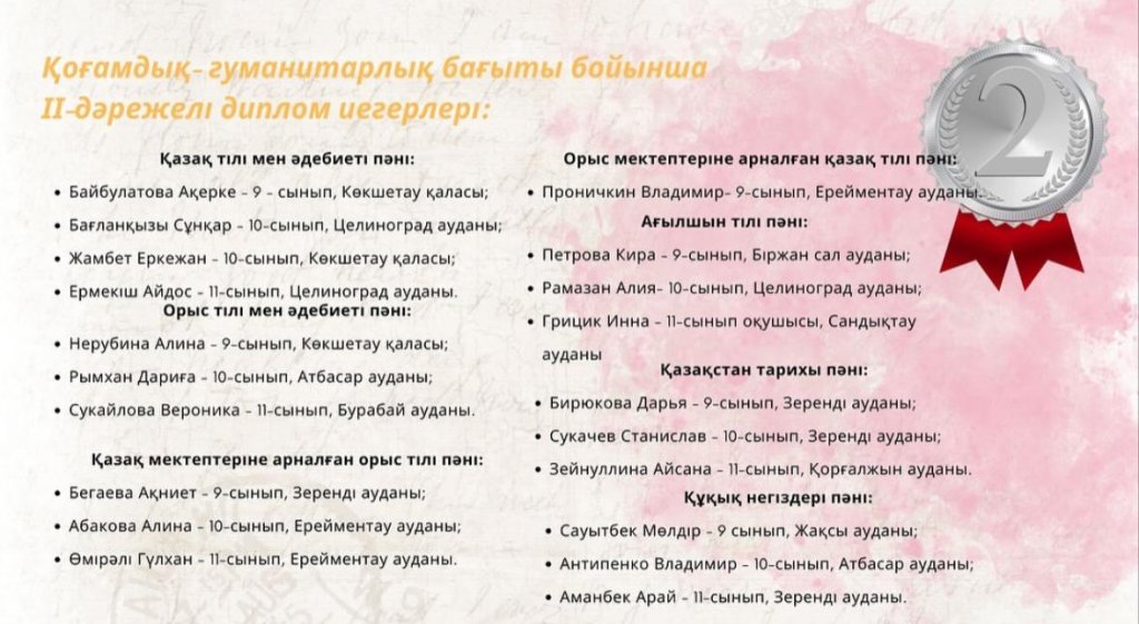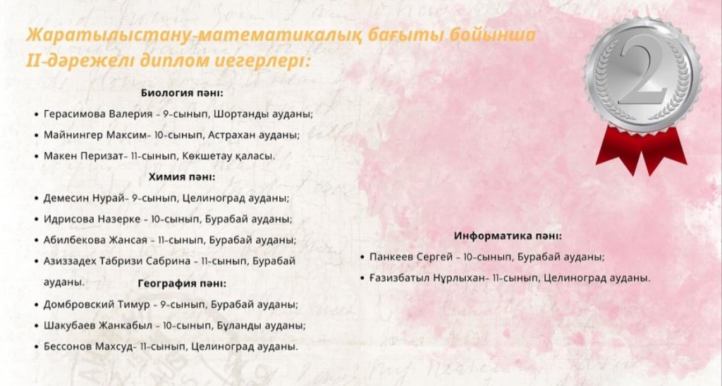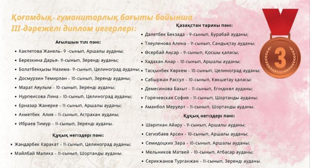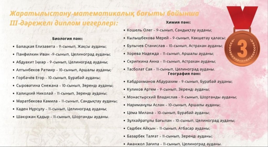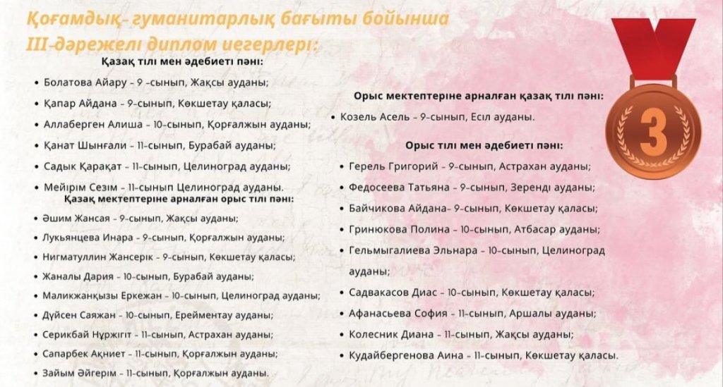 Сәдібек Айқын-3 орын (Мариновка №1), Гринюкова Полина -3 орын (Мариновка №1), Мельников Матвей - 3 орын (Мариновка №1)