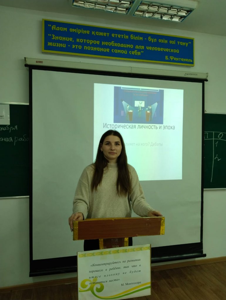 Тарих пәнінің мұғалімі Запорожская Екатерина Владимировна жанды пікірталас атмосферасын құрды, онда оқушылар тек дәлелдер келтіріп қана қоймай, бір-бірін тыңдап, әртүрлі көзқарастарды салыстырып, қорытынды жасауға үйренді.