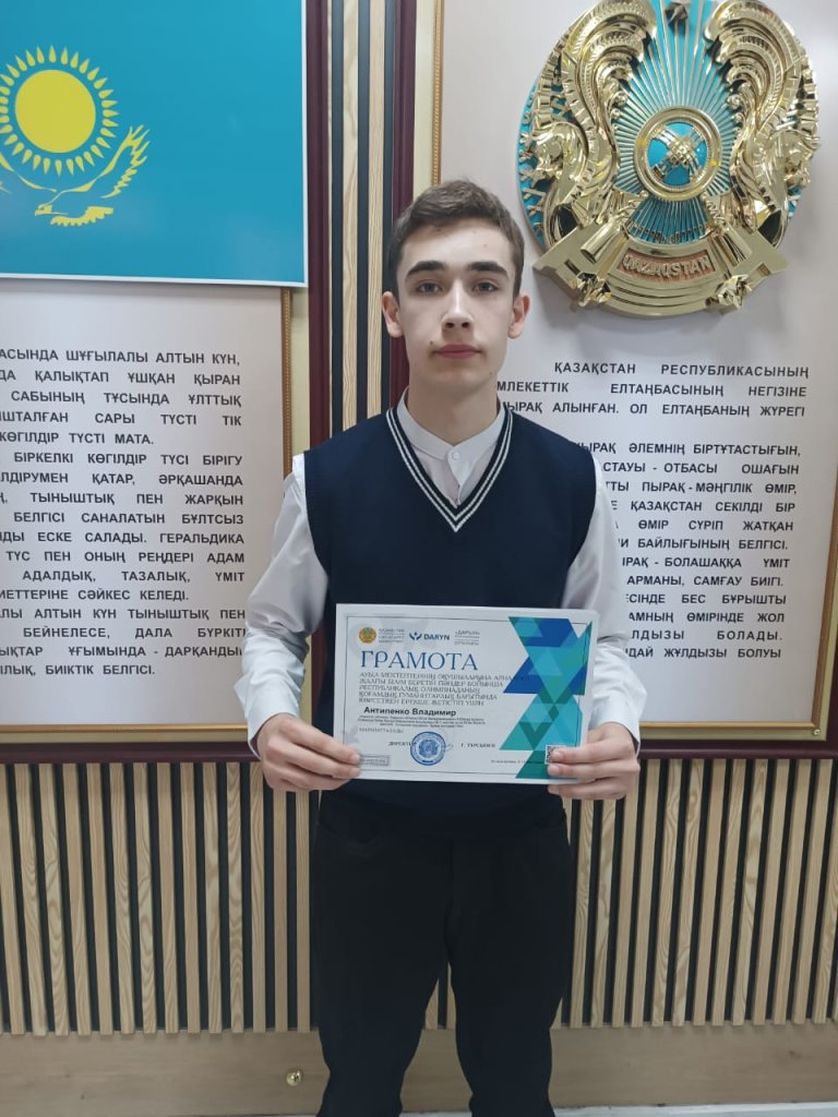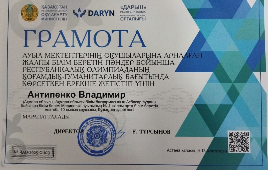 Құқық негіздері пәні бойынша ерекше жетістіктері үшін республикалық олимпиаданың қатысушысы "Мариновка ауылының N1 ЖББМ" КММ-нің 10 сынып оқушысы Владимир Антипенко (мұғалімі Калмаганбетов Мирас Садибекович) грамотамен марапатталды. Құттықтаймыз!